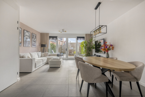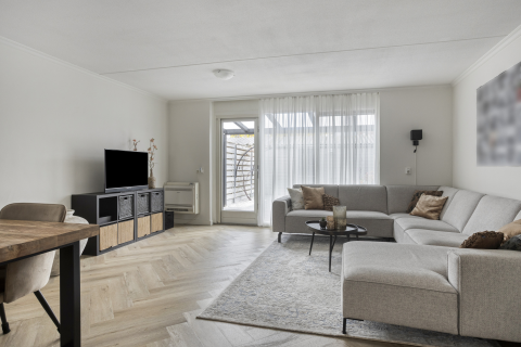 Vanuit de hal kom je in de woonkamer met open keuken. Het eerste wat opvalt: het licht en de ruimte. De luxe laminaatvloer, de strak afgewerkte wanden en plafonds zorgen voor een moderne, rustige basis. Aan de voorzijde, met vrij uitzicht, is nu een grote hoekbank geplaatst met een tv-meubel. De eethoek vind je aan de achterzijde, tegenover de open keuken.